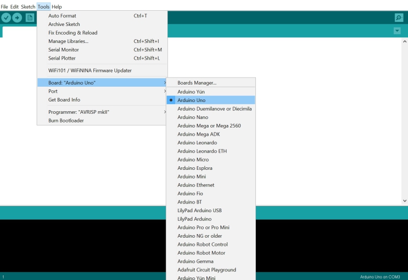 Select the Arduino Board you are using (in this case its an Arduino Uno)