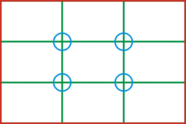 This simple guideline has been used for centuries and is one of the most used composition techniques. Once you have been introduced to it you will be able to identify it’s use in many of history’s great paintings and photographs.. The “Rule of Thirds” simply states that an image can be divided into three horizontal sections and three vertical sections and that the four intersection points (shown in blue) formed by these transition lines (shown in green) are the best areas to place the important components of your image. One handy use of the Rule of Thirds is to place the horizon in an image near one of the two horizontal lines (you can also place vertical objects along the vertical lines). This helps to add a dynamic balance to your image.