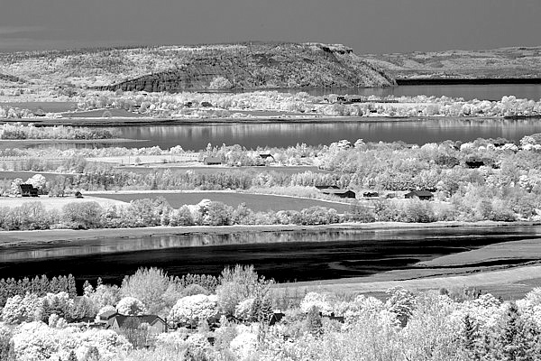 Near-infrared photography records the infrared light that is reflected off an object (normally from the sun) and some objects reflect more infrared light than they do in the red, green or blue part of the spectrum. You will find that green grass and healthy vegetation often reflect more infrared light than other parts of the spectrum (that’s why grass and healthy vegetation look so bright) and water or blue skies reflect very little infrared light relative to other parts of the spectrum (this is why water and a blue sky look dark or black). This shift in brightness values compared to the visible spectrum is what makes infrared images look so unique.